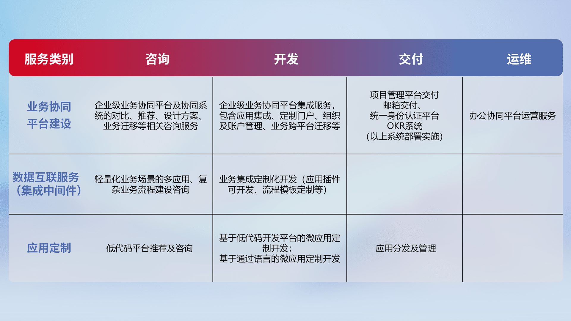 针对钉钉、、、企微、、、、IDaas等平台级产品提供产品的规划、、、、方案、、、、交付、、、、定制化开发等服务,,实现如统一协同办公、、智能客户服务、、、混合会议管理、、智能数据查询、、等业务场景,,实现数字化转型。。。